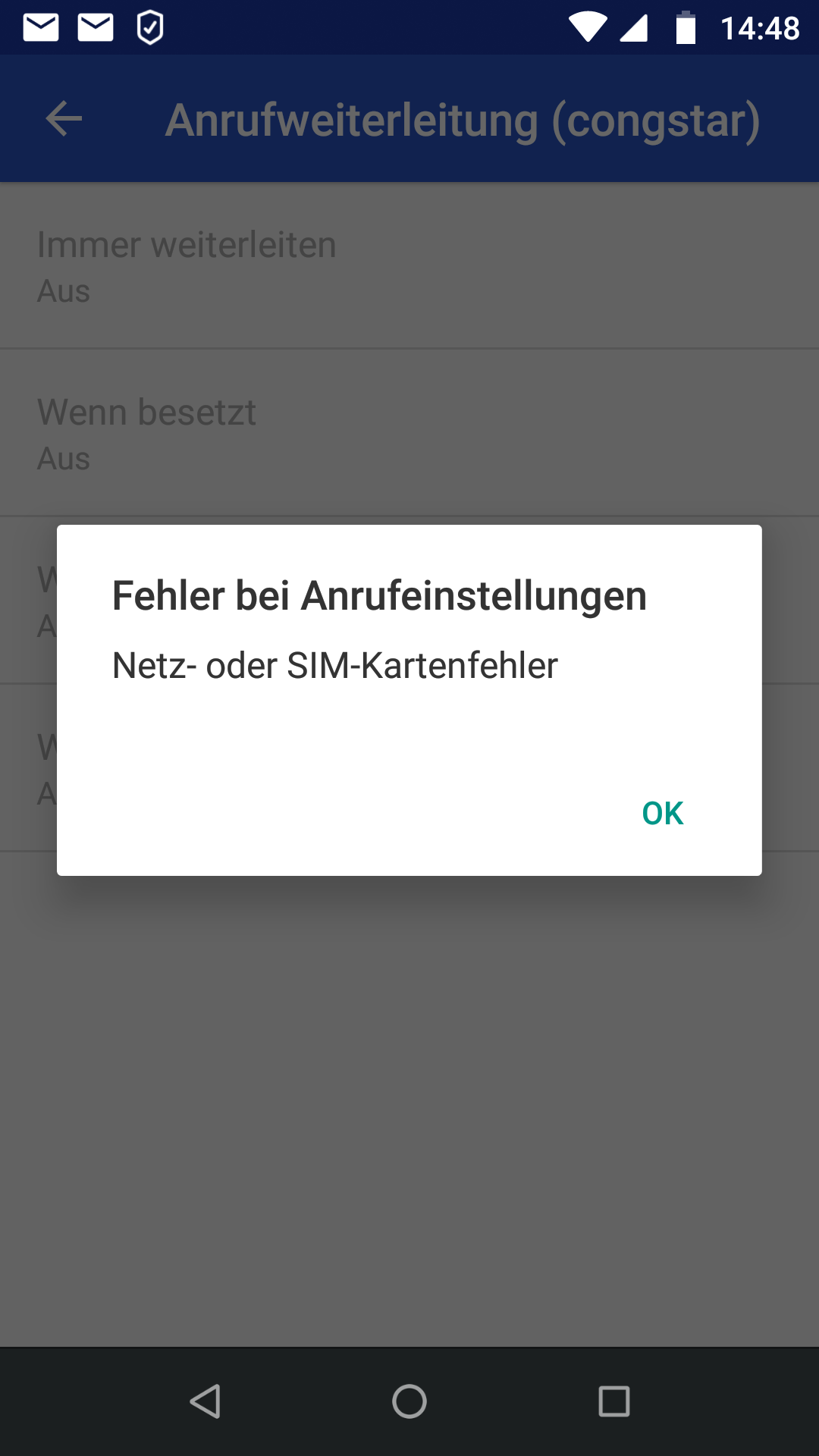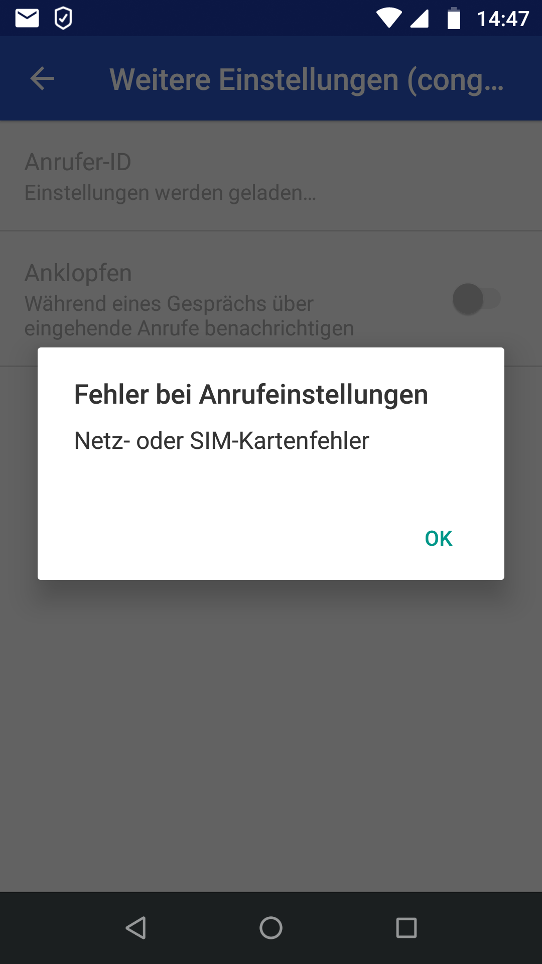 Es kommt eine Meldung: Fehler bei Anrufeinstellungen Netz- oder SIM-Kartenfehler.