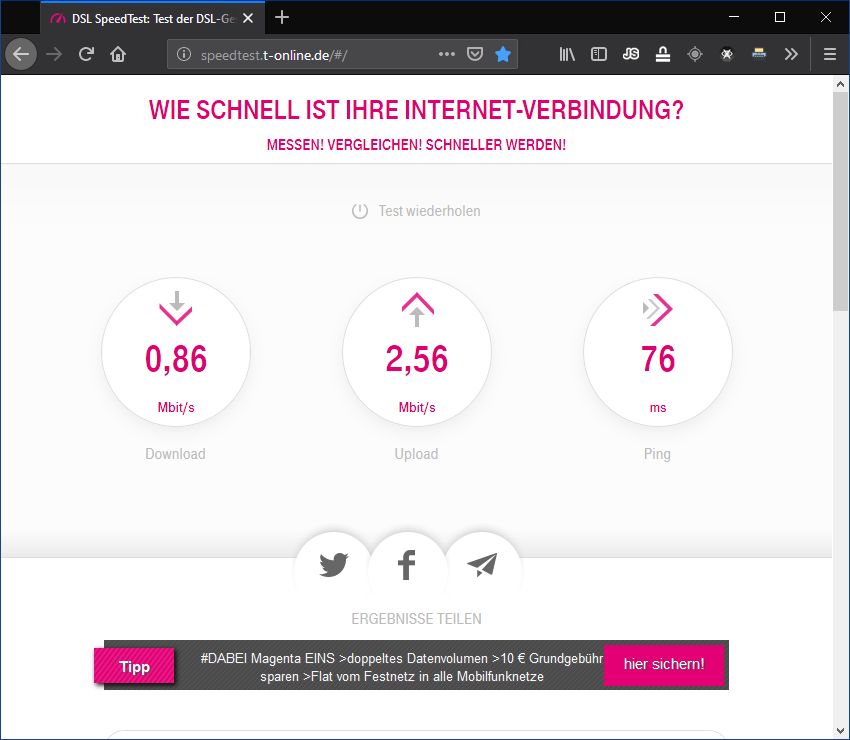 Also grundsätzlich kann ich die Aussage hier im Forum bestätigen: Die Bandbreite (bei mir hier LTE 800) über den Homespot ist tagsüber schlecht (0,8!! bis 4 Mbit, gemessen mit verschiedenen Tools, T-Online Speedtest, usw.) aber plötzlich so ab 1 Uhr in Nacht ist die Bandbreite (zumindest) akzeptabel (8 bis 12 Mbit). Also das ist kein Internetzugang sondern eine Katastrophe und ich vermute eine Überlastung der Funkzelle. Darauf lassen mich auch die vielen Hybridrouter der Telekom schliessen, die ich bei meinen Kunden im Umkreis gesehen habe (alle in der selben Funkzelle).