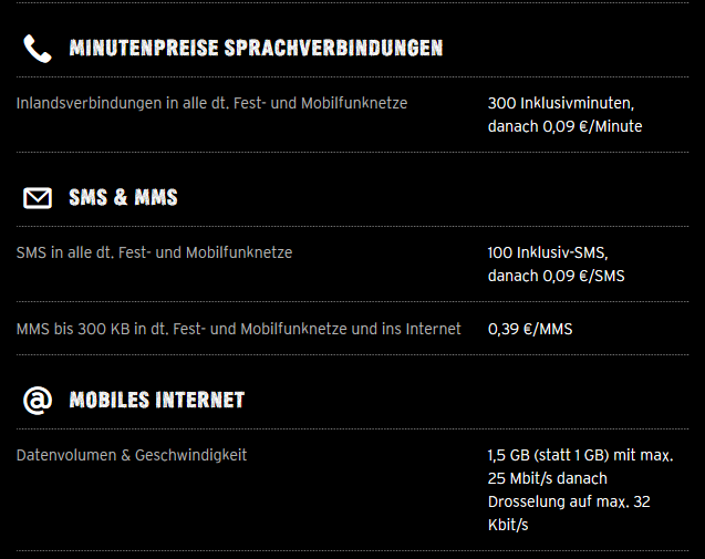 Dann bin ich ja beruhigt....aber zu schreiben: "300 Minuten in alle dt. Netze, danach 9 Cent/Min" ist auch nicht so verkehrt ![]()