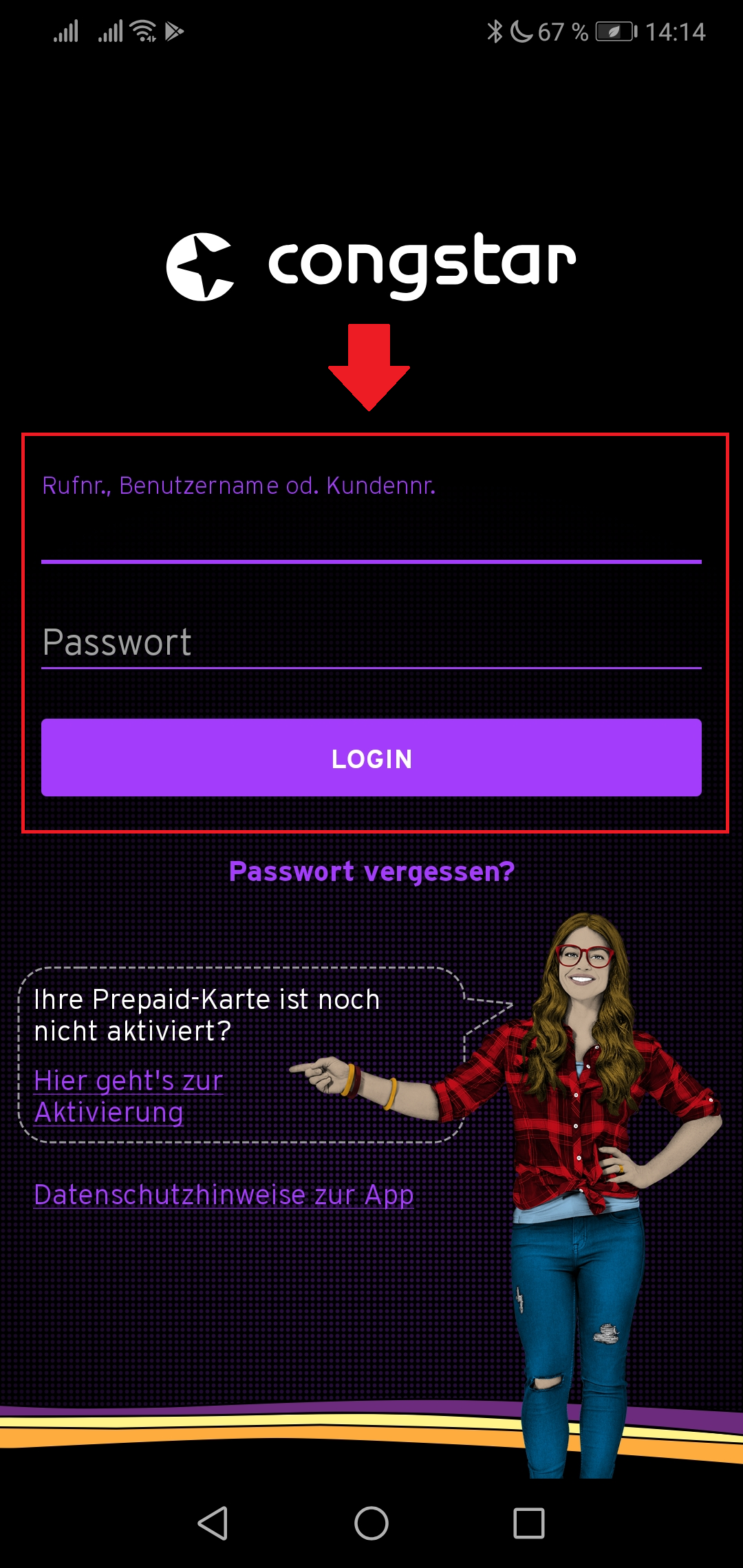 Loggt euch mit congtar Nummer/Rufnummer/Benutzer*innennamen und Kennwort in der congstar App ein: