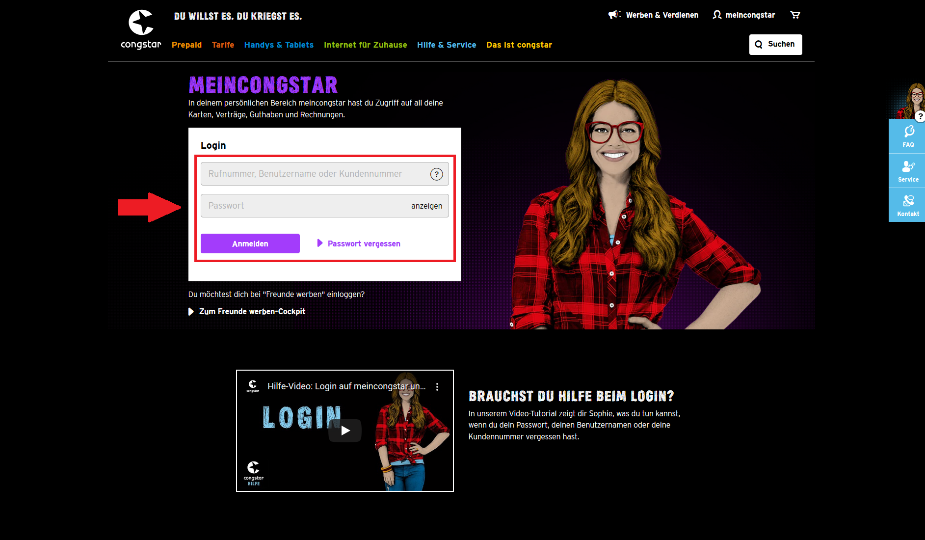 Loggt euch mit eurer congstar Kundennummer/Rufnummer/eurem persönlichen Login und Kennwort auf https://www.congstar.de/login ein: