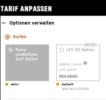 Allerdings habe ich seitdem kein LTE mehr, In der Optionsverwaltung steht aktuell noch ein Haken bei "keine zusätzliche Surf Option", die LTE 50 Option ist ausgegraut und hat den Status "bestellt" und "aktiv ab 27.08.2019" (also eigentlich auch seit vorgestern).