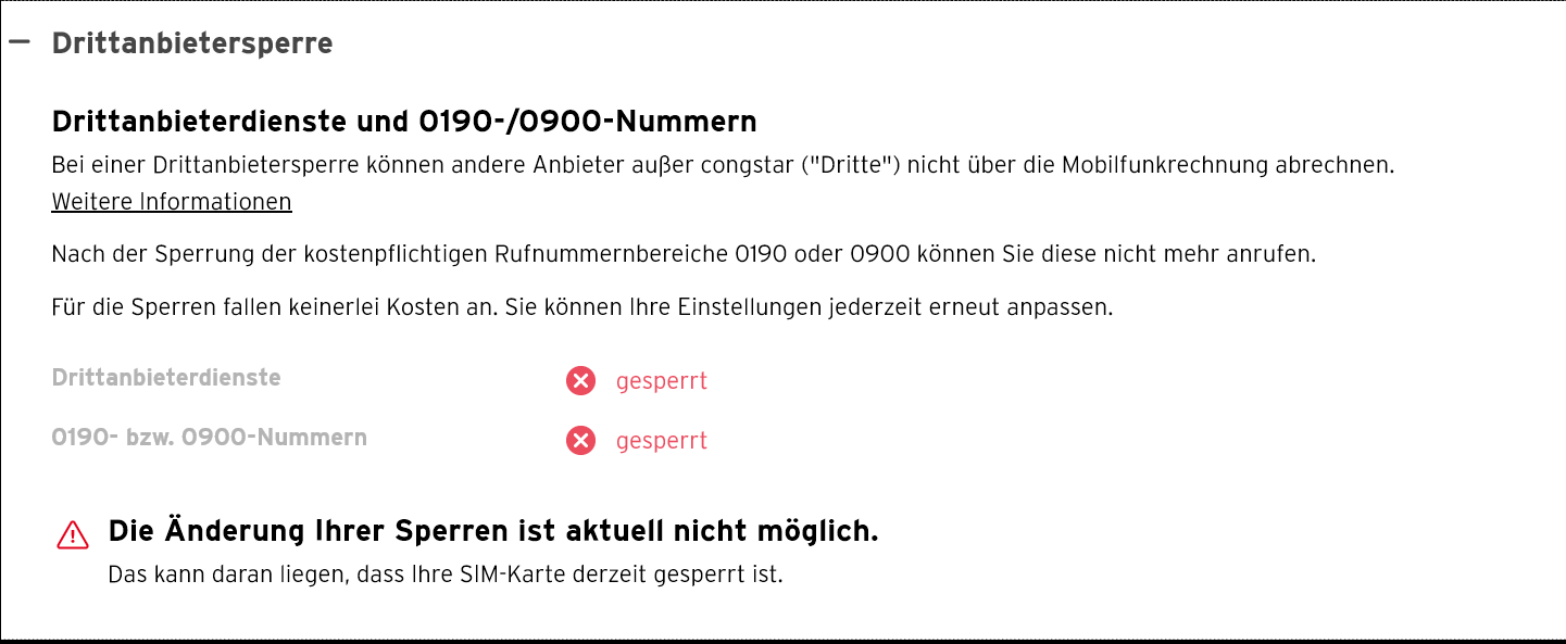 Die Sperren für Drittanbieter und 1900er/0900er Rufnummern sind bei dir aktiv. Da du vor einigen Tagen deine Kundendaten geändert hast, kannst du diese Sperren nun für 14 Tage nicht selbst ändern. Das ist eine systemseitige Datenschutzmaßnahme.