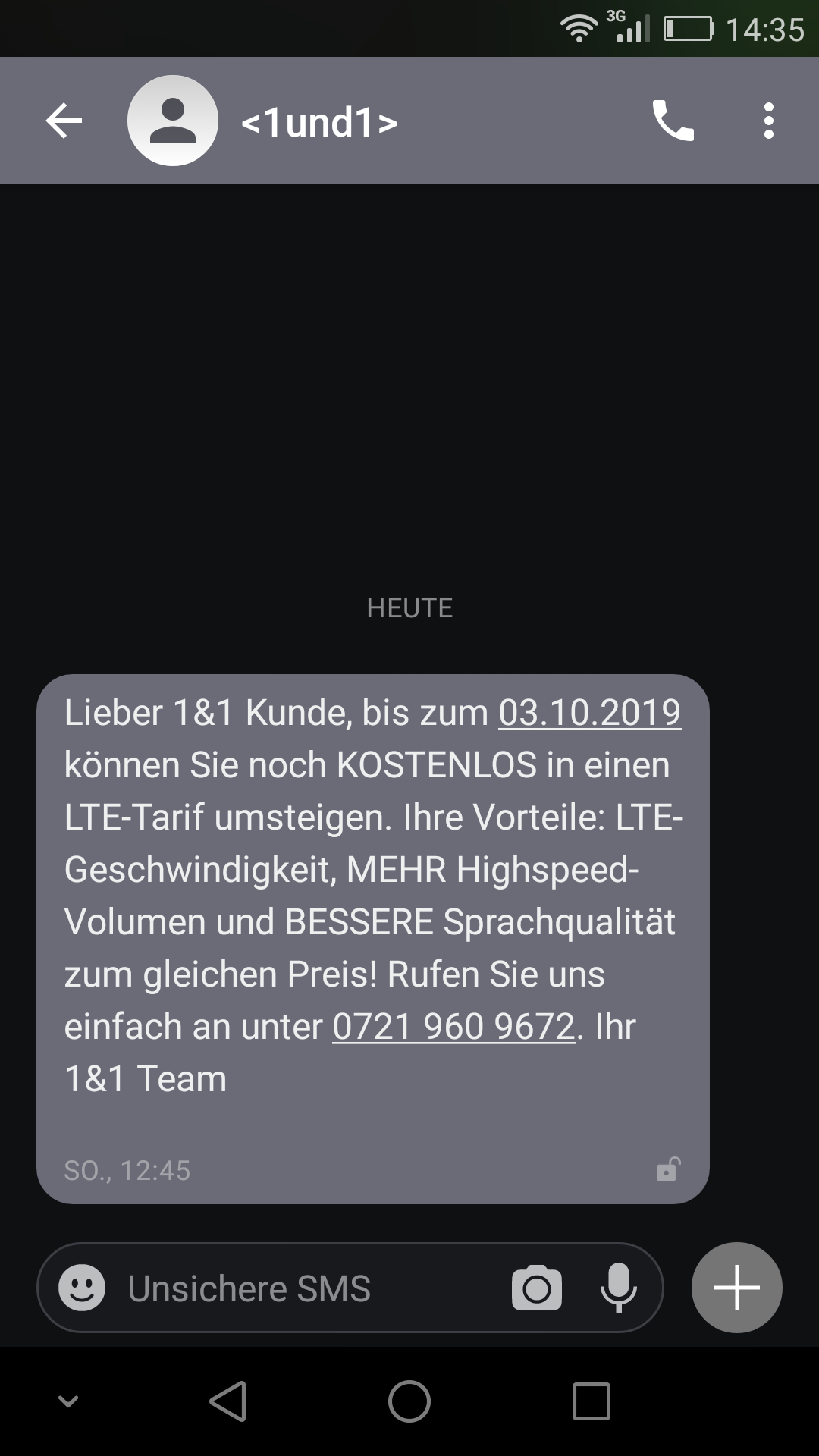 Ich habe den Congstar Prepaid Tarif "Prepaid wie ich will" der ersten Generation und habe heute eine SMS erhalten, die angeblich von 1&1 ist und einen angeblich kostenlosen Umstieg auf LTE verspricht. Einen Screenshot der SMS habe ich beigefügt.![]()