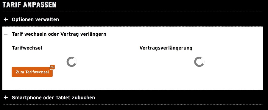 ein Bekannter mit einem Allnet Flat Tarif hat die Tage einen Tarifwechsel via Kundendencenter durchgeführt. Ich wollte nun auch mal sehen, was bei mir und meiner besseren Hälfte (beide im Allnet Flat Plus Tarif) hier im Kundencenter was so angeboten wird. Bei meinem Bekannten stand hier u.a. der Hinweis, dass sich beim Wechsel die Vertragslaufzeit nicht verlängert wird. Bei mir und auch meiner besseren Hälfte befindet sich dort dagegen ein animiertes Ladesymbol, das nicht verschwinden will. Ich habe bereits verschiedene Browser (mit und ohne Addblocker) und Endgeräte getestet - bei allem keine andere Anzeige. Soll das so sein oder liegt ihr bei euch ein Fehler vor?