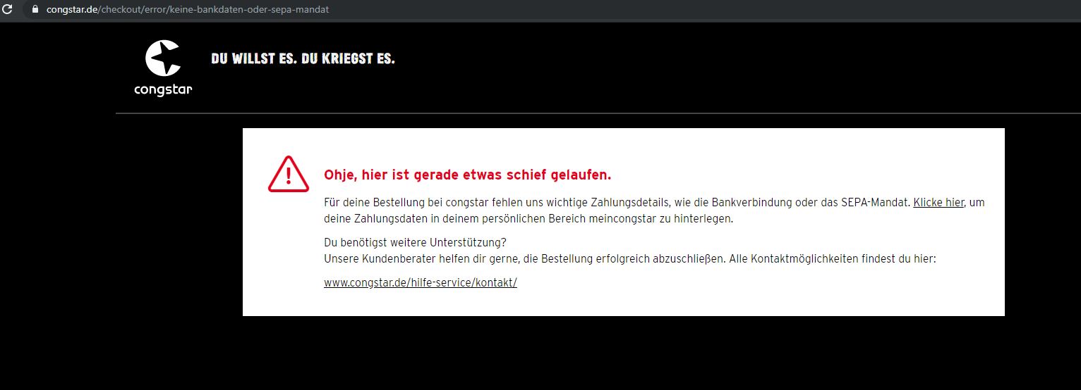 Bei einer Neuregistrierung erhalte ich die Meldung, dass es einen Account mit meiner E-Mail Adresse gibt, ja da hab ich sogar noch die Daten, also logge ich micht halt ein. - Beim Einloggen mit meinem meincongstar Account erhalte ich die Fehlermeldung, das keine Bankverbindung oder ein SEPA Mandat hinterlegt ist. Genau jenes ist aber hinterlegt und ich habe bereits auch die Bankverbindung nochmal eingetippt und den Haken gesetzt.
