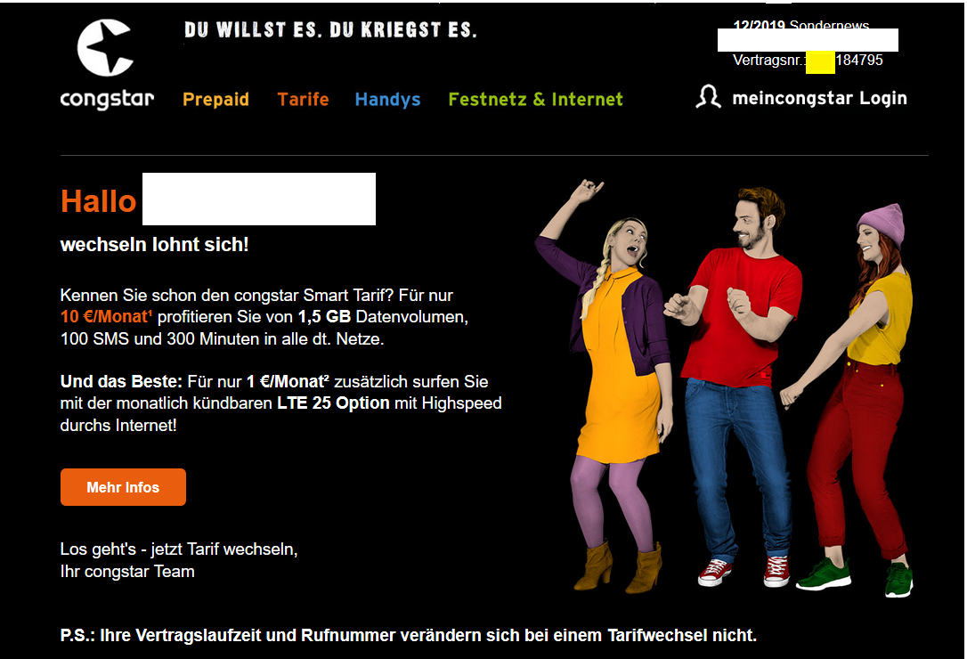 Werbung für Tarifwechsel. Congstar hält sich nicht an unterbreitetes Angebot