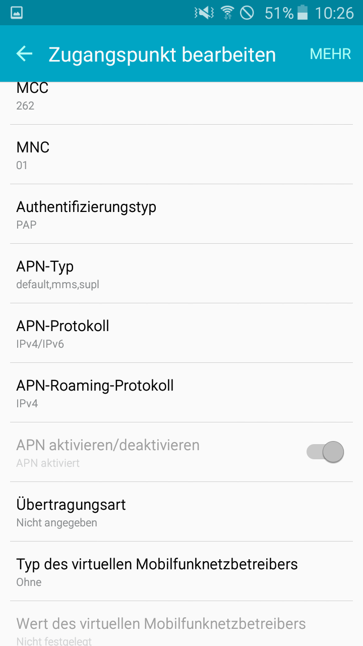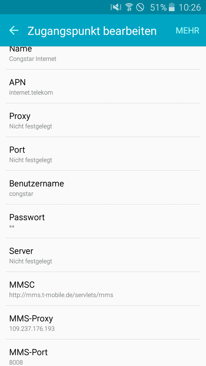 Ich habe die Smartphone-internen Einstellungen mehrmals geprüft und bin mit dem Zugangspunkt Congstar Internet verbunden, mit den richtigen Einstellungen, die ich im Netz gefunden hab und die auch vorher schon so eingestellt waren. Wenn ich weitere Netzbetreiber suche mit meinem Smartphone, finde ich keine. Auch hab ich mein Smartphone schon mehrmals neugestartet.