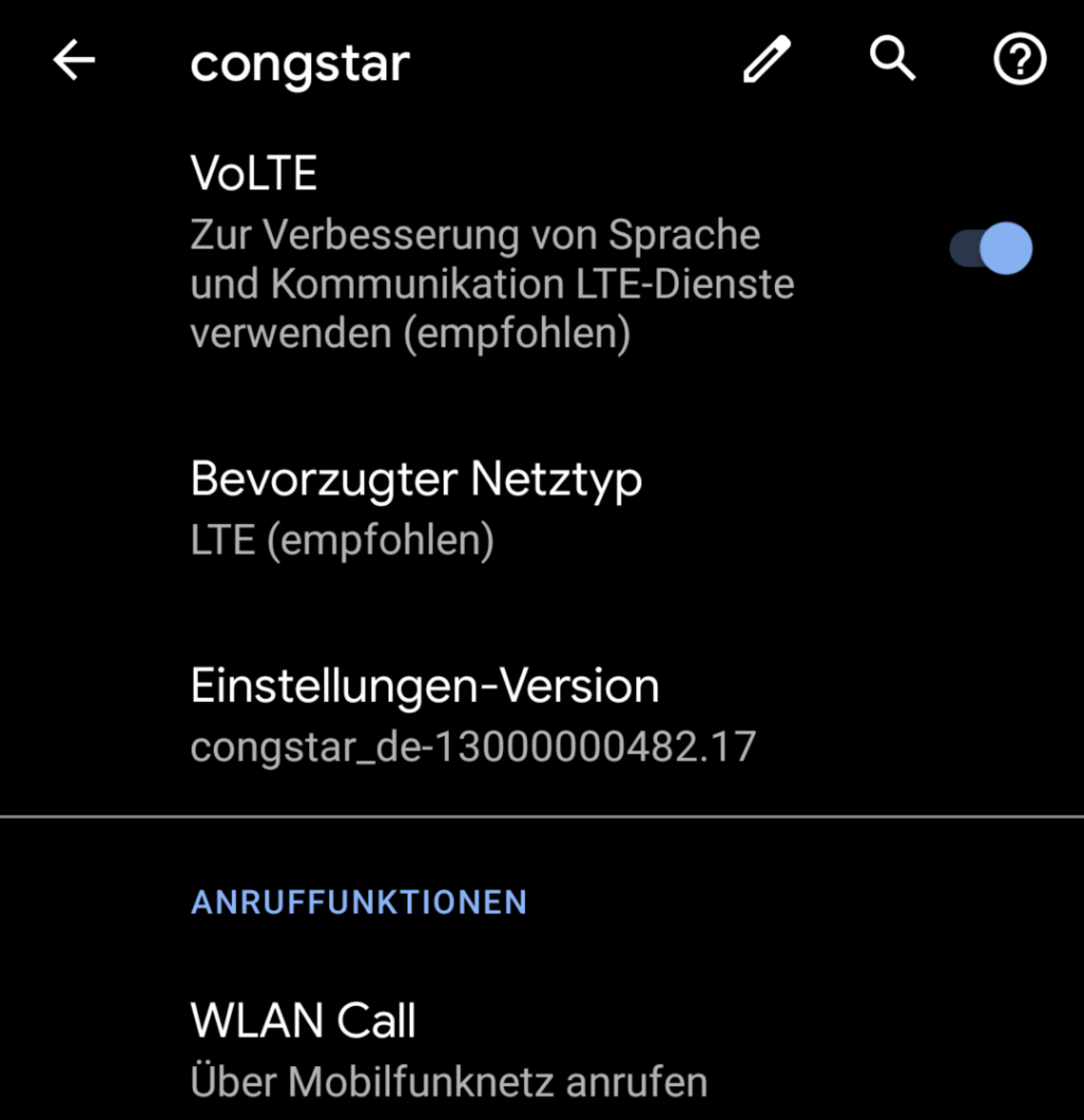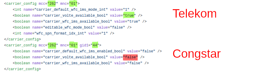 • Ich besitze ein Google Pixel (2016) mit Android 10, welches keine Updates mehr von Google erhält. Das Modell unterstützt wohlgemerkt VoLTE und die CarrierConfig für dieses Modell (Codename: sailfish) enthält auch die Information, dass VoLTE im Telekom-Netz verfügbar ist. Congstar nutzt den Telekom-APN allerdings mit einem besonderen Group Level Identifier (GID), nämlich 44, und in der CarrierConfig Stand Oktober 2019 (letztes Sicherheitsupdate für das Pixel) ist leider hinterlegt, dass Congstar kein VoLTE unterstützt: