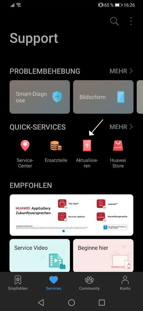 Oder mal über die "HiSuite" versuchen?Auf einmal ist die Option "Aktualisieren" wieder in der Support-App, die sich früher HiSuite nannte. Aber auch darüber bekomme ich keine Aktualisierung