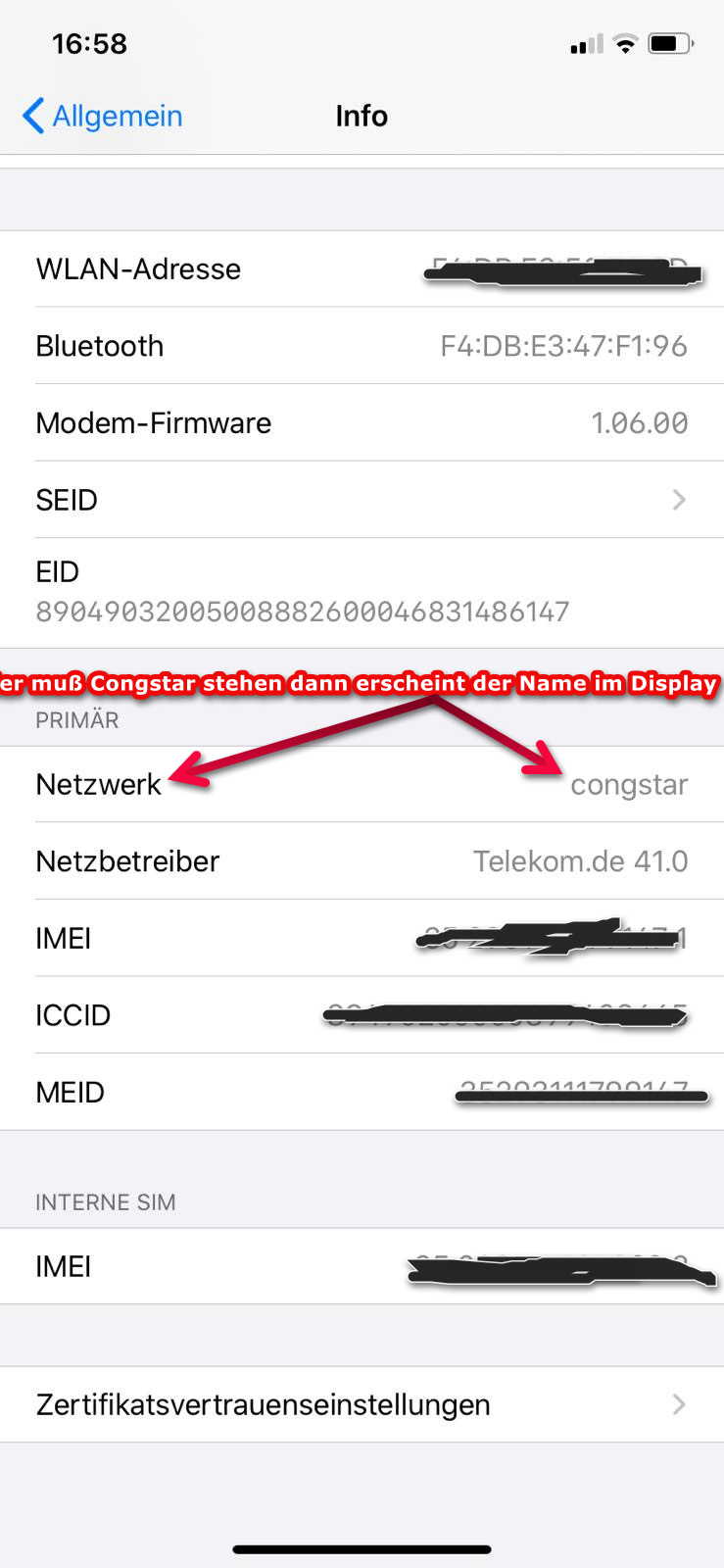 Also wenn Congstar wie von mir beschrieben den Schriftzug in " Netzwerk" einfügt erscheint der Schriftzug auf dem Apple I-Phone.