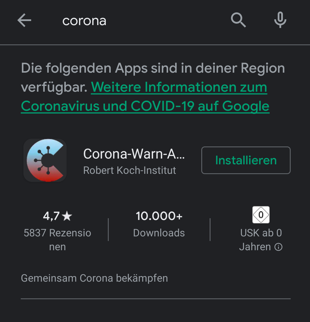 Heute gibt es wieder einen kurzen Einblick in mein digitales Leben. Wie so viele habe ich heute Morgen die neue, von der Bundesregierung geförderte Corona-Warn-App installiert. Mit meinem aktuellen Android-Gerät kann ich dafür einfach den Google Play Store nutzen.