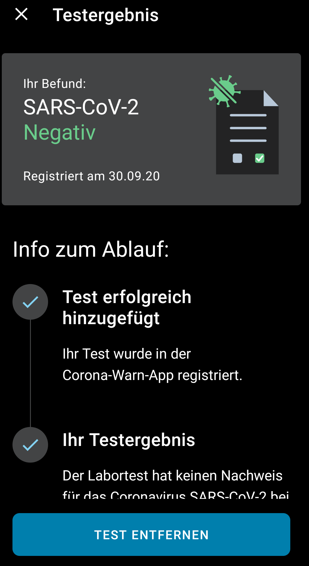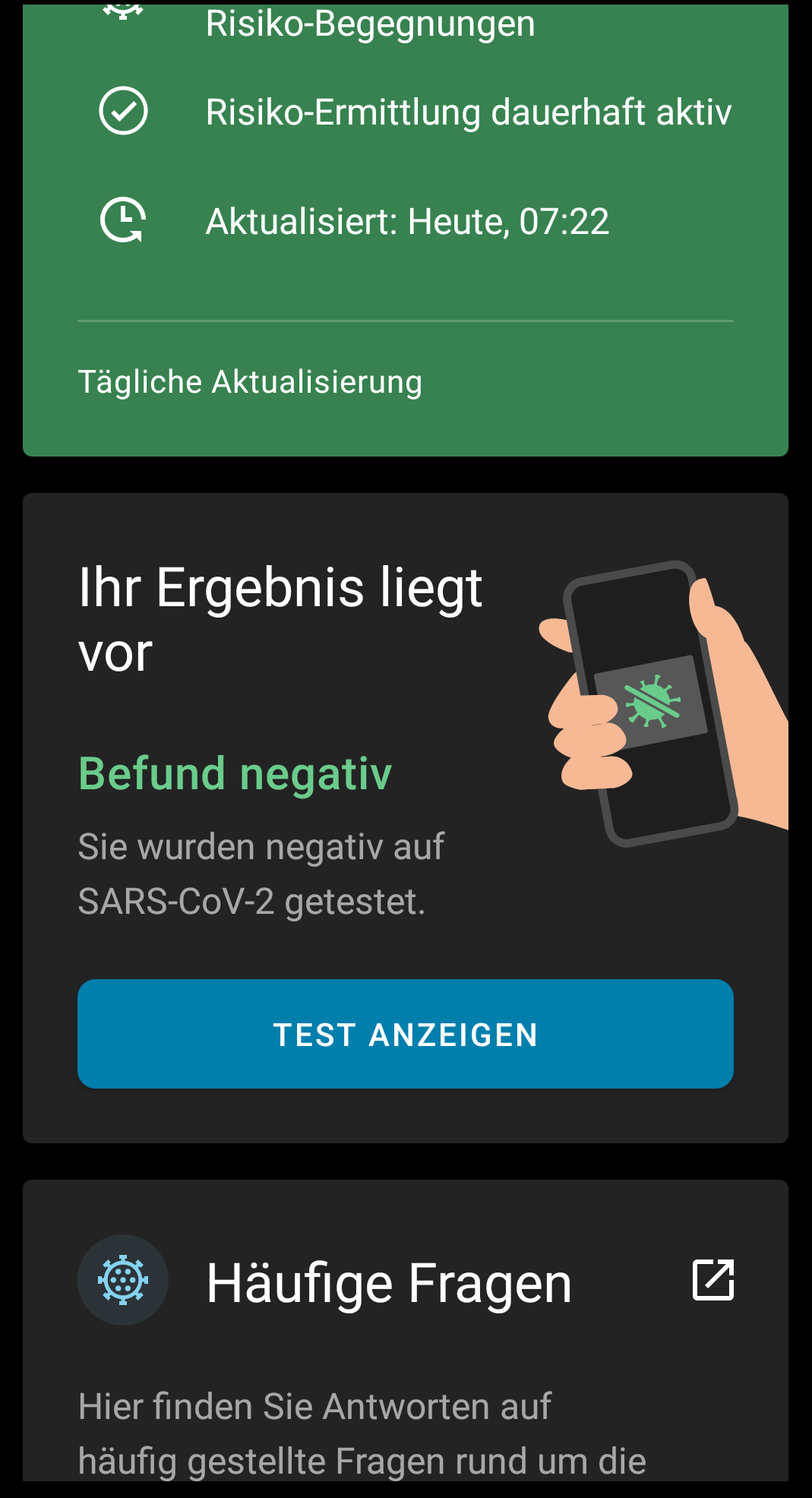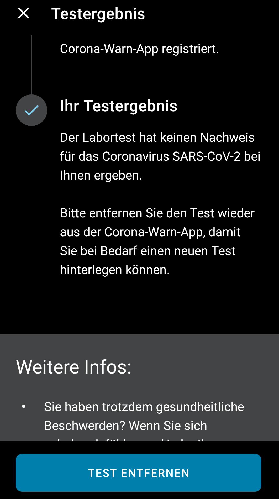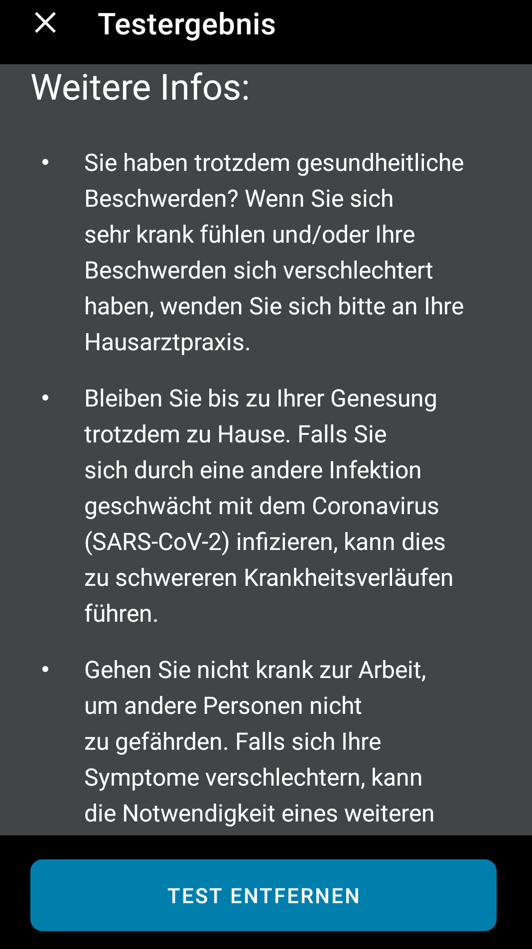 - „Falls Sie Corona-positiv getestet werden… …teilen Sie es bitte über die Corona-Warn-App mit. Freiwillig und sicher. Für die Gesundheit aller.“ -> „Weiter“