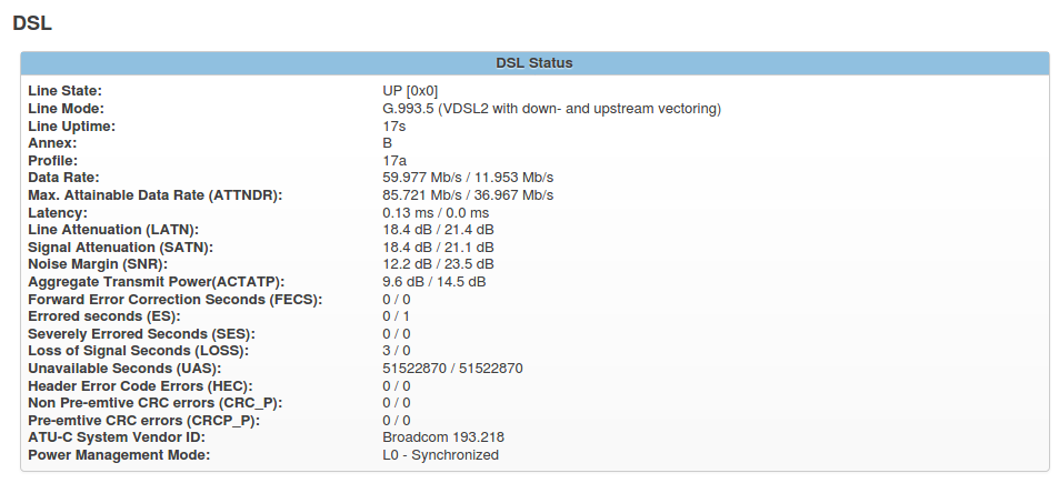 Line Attenuation (LATN): Down: 11.3 dB / Up: 5.7 dB