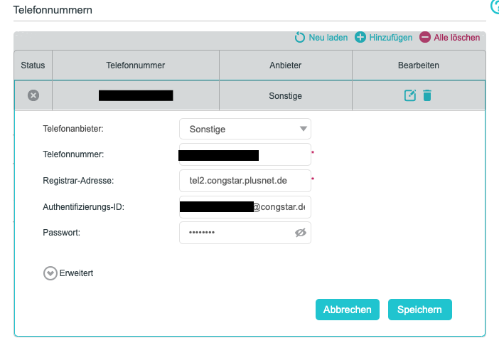 Ich habe Voreinstellungen für Congstar(Telekom) sowie Congstar(QSC), sowie sonstige Anbieter mit der Registrar Adresse tel2.congstar.de sowie tel2.congstar.plusnet.de probiert.