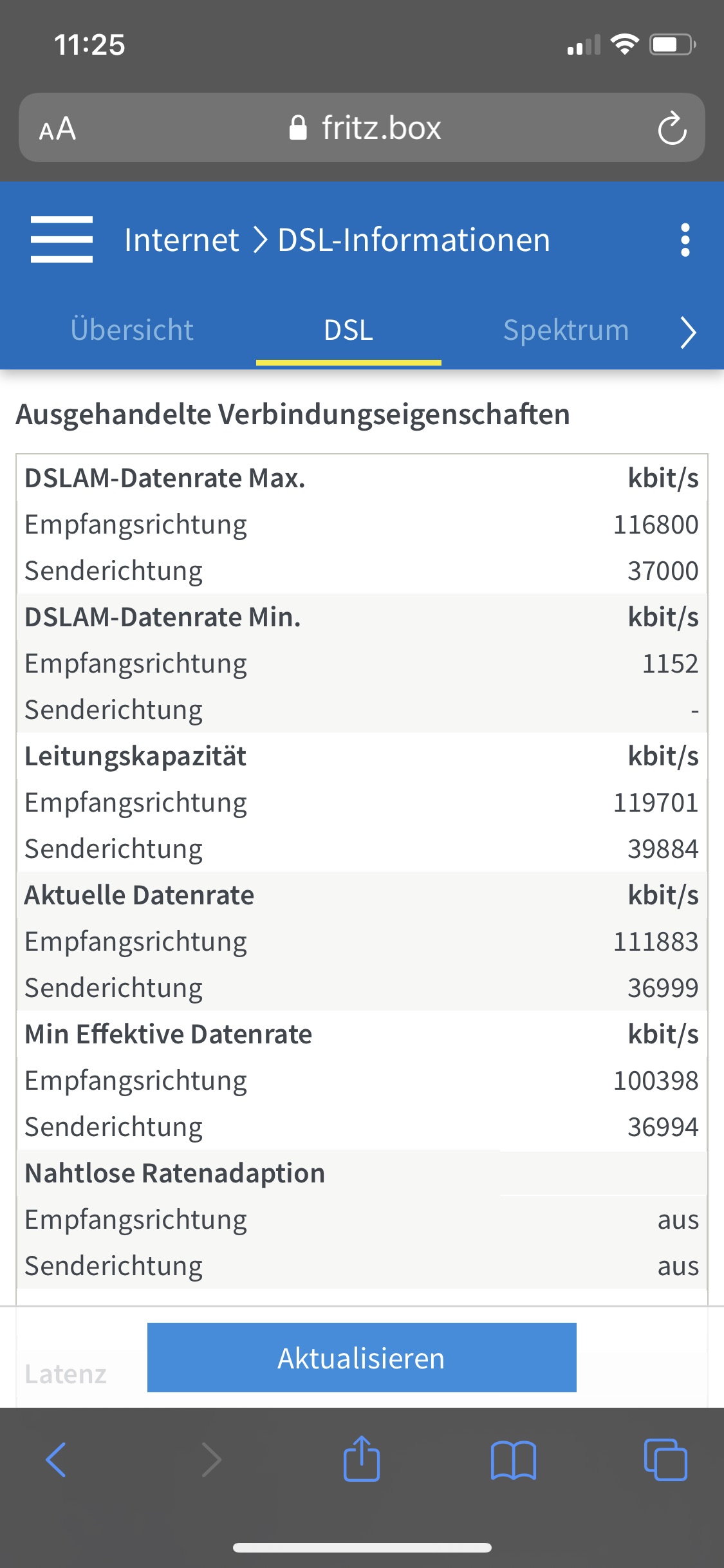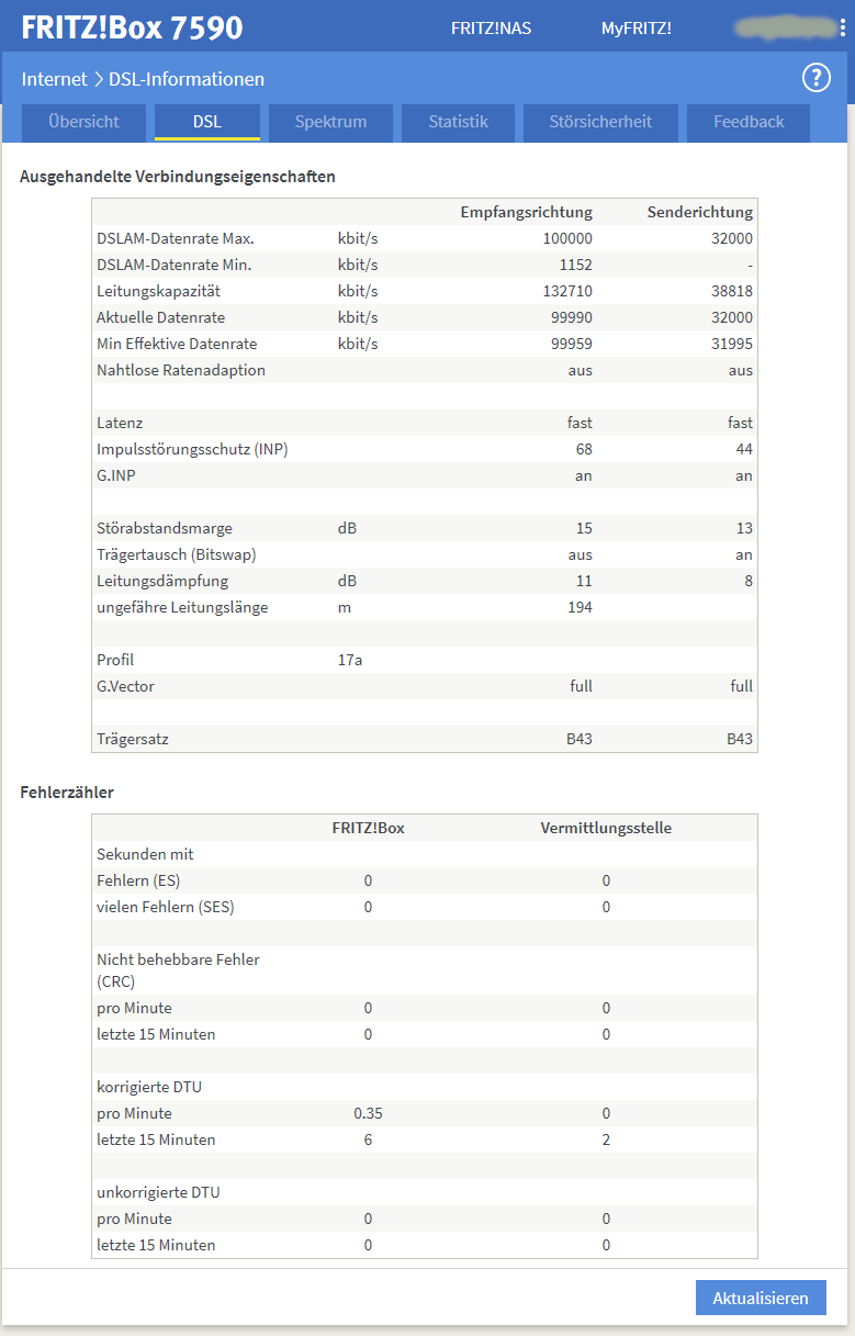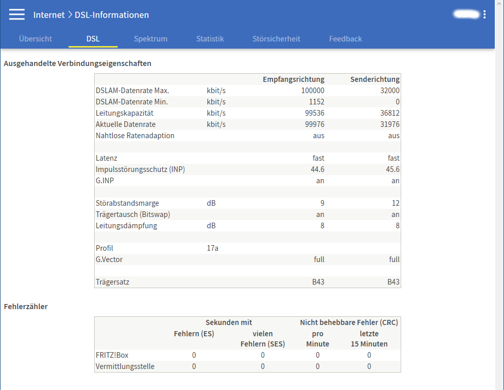 Seit 25.09.2020 hat sich mein DSL-Anschluss geändert, ich nehme an das Vectoring wurde aktiviert (laienhafte Annahme). Die Leitungskapazitäten werden plötzlich mit 100/32 MBit/s erkannt. Dann hat sich schrittweise, nach einigen Tagen, die aktuelle Datenrate ebenfalls erhöht und landet nun bei gerundet 100/32 MBit/s. Siehe anliegender Screenshot der FritzBox. Die DSLAM-Datenrate Min. stimmt irgendwie nicht.