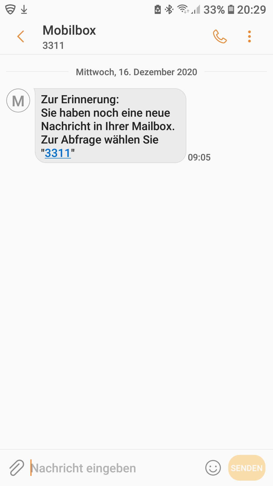 Bei der Abfrage fiel auf, dass die Mailbox offensichtlich neu aufgesetzt wurde. Ich musste sie neu besprechen. Dann habe ich im Verlauf des Tages noch zwei Versuche mit der Mailbox durchgeführt. Beide führten zu unmittelbaren SMS Benachrichtigungen. Jetzt scheint es ja endlich zu klappen. An alle engagierten Beteiligten ein herzliches Dankeschön.