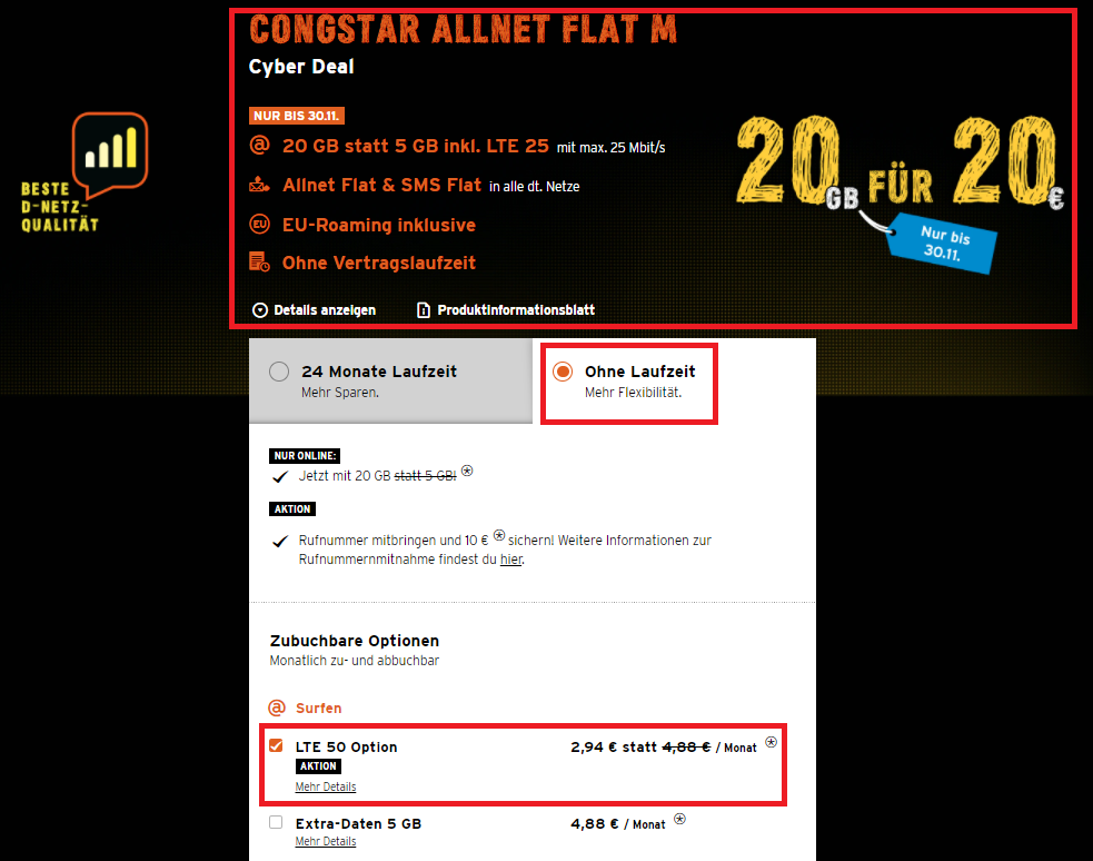 würde sich mal ein Mod meinen Vertrag ansehen. Habe am 26.11.2020 den Allnet Flat M Tarif abgeschlossen - finde aber keine Bestätigung das ich auch die 20 GB (CyberDeal) bekomme!