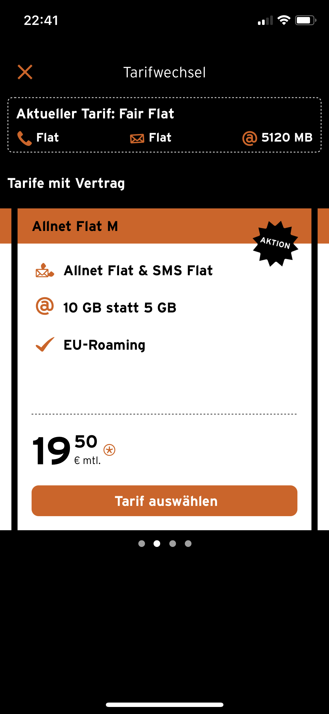 Alternativ kann ich dir die gewünschten Wechsel von der Fair Flat zum Cyber Deal Angebot Allnet Flat M 20 GB auch hier einstellen.
