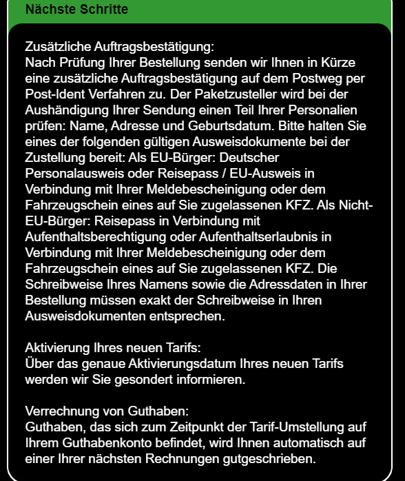 Ich habe keine offizielle Instruktion bekommen, dass ich mich angeblich bei der Post identifizieren muss und der Tarifwechsel deswegen bei mir still liegt!! Zumal ich seit Jahren schon Prepaid Kunde bin, seit ca. 10 Jahren glaube ich.