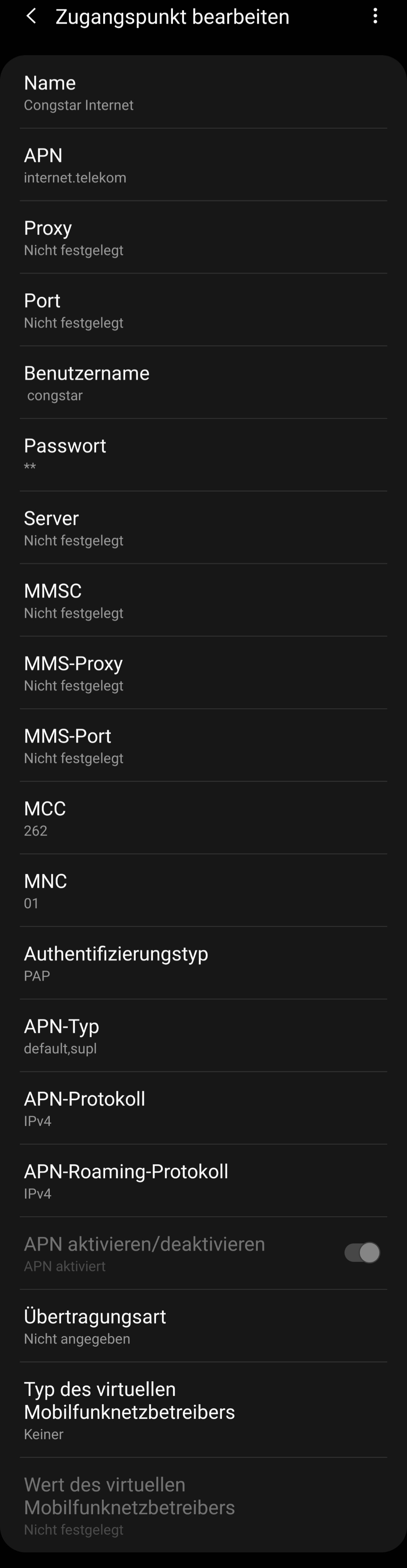 Hatte als Name Congstar Internet, habe jetzt wie C. Merkel alles eingestellt, also Telekom und internet.v6.telekom. Es funktioniert trotzdem nicht. Es erschwint auf dem Handy immer, soll mich im Netz anmelden. Auch Neustart hat nichts gebracht.