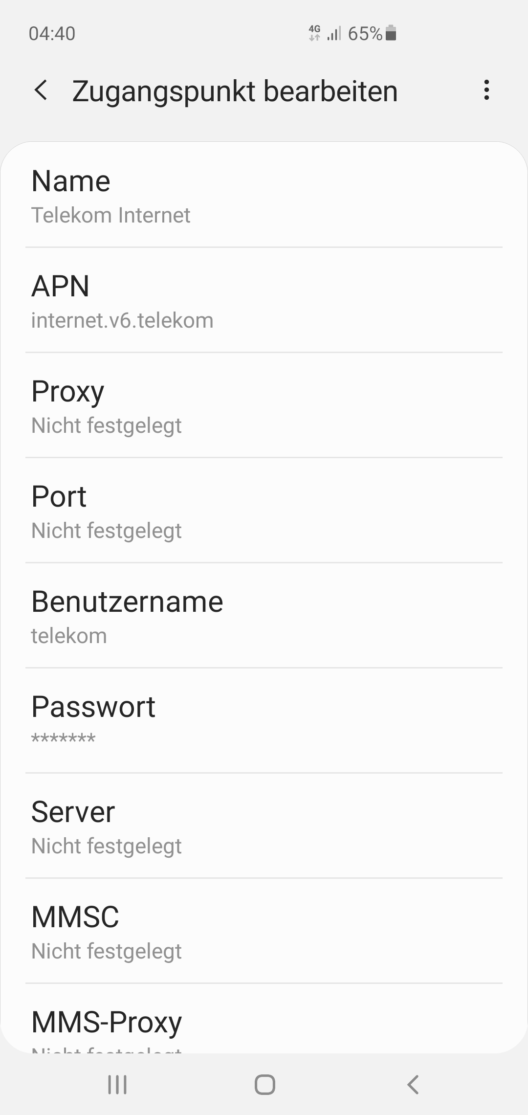 Versuch auch mal anstelle APN internet.telekom mal internet.v6.telekom und telekom Nutzername und Passwort. So ist es auf unserem Samsung A40 standardmäßig eingerichtet.