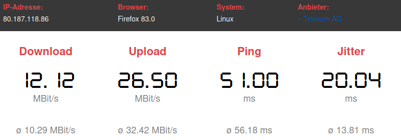 Nachdem ich schon vor Jahren eine LTE Antenne an der Router angeschlossen, den besten Funkmasten im Umkreis ermittelt und die beste Antennenstellung im Raum "erkundet" hatte, kam ich auf runde 30-40 MBit/s. Dieser Durchsatz war konstant abrufbar. (Gibt auch einige Forenbeiträge dazu...) Damit konnte ich gut leben.
