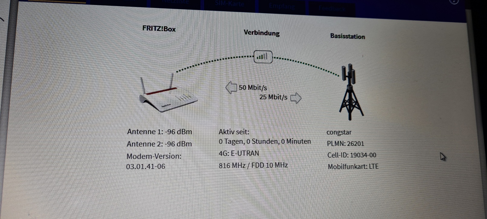 ich denke ich empfange eine falsche Mobilfunkzelle (zwecks Homespotadresse), aber ich bekomme auch keine andere mehr rein, keine Ahnung warum ich am Anfang eine kurze Verbindung hatte, der LTE-Router empfängt nur noch diese Zelle egal wo hin ich die Antenne drehe., nur eben besser oder schlechter, oder Zellen anderer Provider. Wir sind hier völlig in der Pampa, der Empfang ist mit Handy auch nicht so dolle.