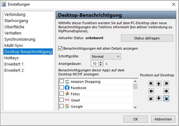 Hier kann anhand der installierten Apps ausgewählt werden, von welcher App man eine Benachrichtigung des Smartphones auf dem Desktop erhalten möchte und auch die Position auf den Desktop, sowie die Dauer.