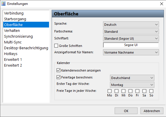 Hier besteht die Möglichkeit die Sprache zu ändern oder auch die Farbe. Ebenfalls können Einstellungen bzgl. der Wochentage vorgenommen werden.