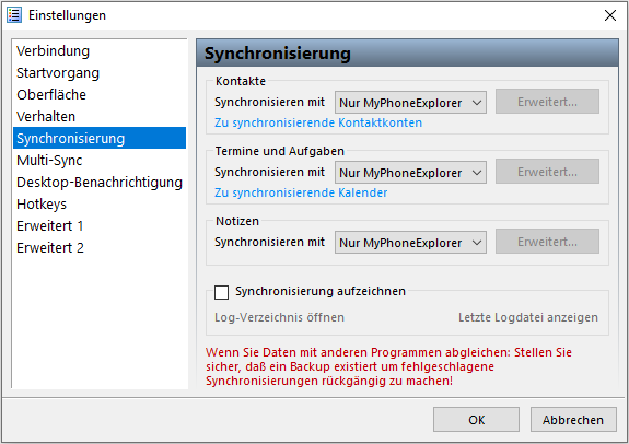 Hier gibt es für jeden Nutzer individuelle Möglichkeiten. Kontakte, Termine oder Notizen müssen nicht zwingend nur mit MyPhoneExplorer synchronisieren. So lassen sich Kontakte z.B. auch mit Windows Kontakten oder Outlook synchronisieren.