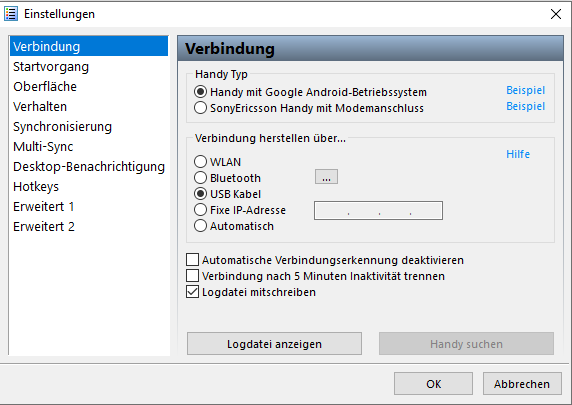 Hier habt ihr die Möglichkeit auszuwählen wie sich euer PC und euer Smartphone miteinander verbinden. Beachtet bitte, bei der Nutzung von WLAN kann sich der Akku verbrauch stark erhöhen.