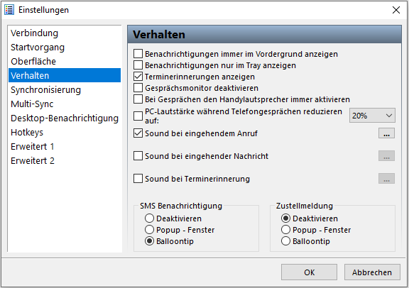 Hier kann der Sound bei eingehenden Anrufen geregelt werden. So kann z.B. die PC-Lautstärke während eines Gesprächs von 0% bis 80 % nach unten korrigiert werden.