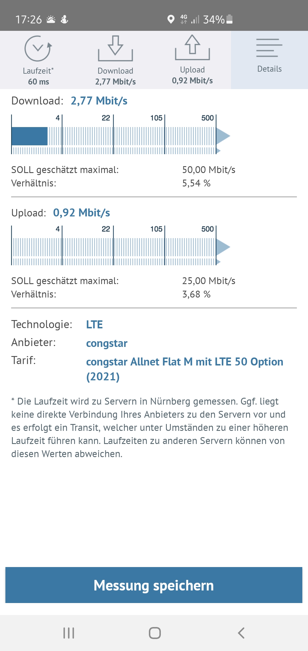 Hallo Max,mobile Daten sind verfügbar.Habe die Messung durchgeführt mit dem Ergebnis : Download soll max 50 Mbit/s , Ist : 2,60 Mbit/s , Upgrade soll max. : 25 Mbit/s , Ist : 0,25 Mbit/s.