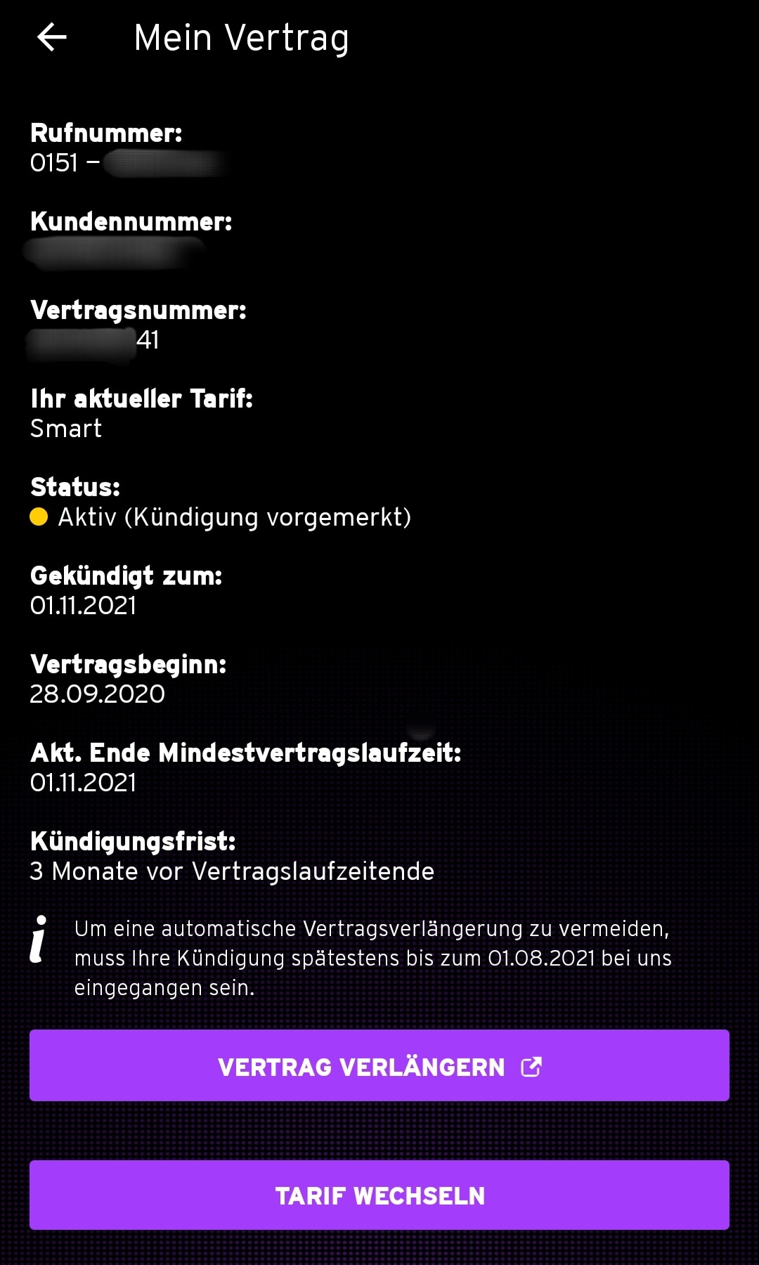 Aktuelles Ende der Mindestvertragslaufzeit: 1. November 2021