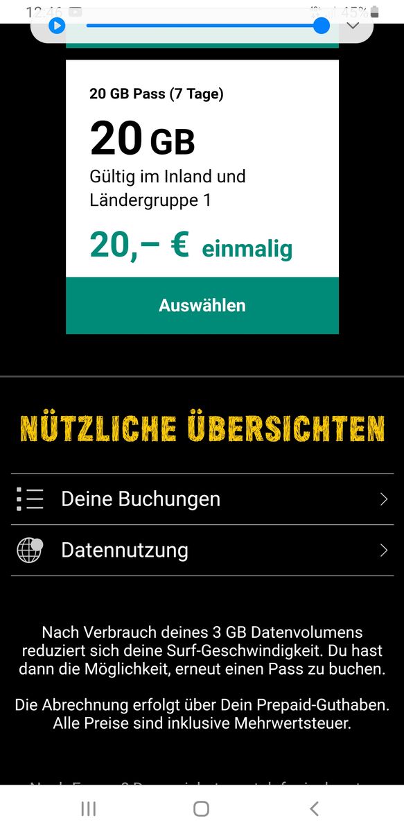 meine Tochter ist im Moment beim Camping, muss aber während dieser Zeit an einem Online-Lehrgang teilnehmen. Für diesen Zweck wollte ich eigentlich einen 20GB-Datapass buchen (oder auch mehrere falls nötig). Habe mich vorher so gut es ging informiert und letzte Woche hätten wir den auch noch buchen können. Jetzt bekommt sie nur noch die sehr teuren SpeedOn-Tarife angeboten. Inzwischen habe ich herausgefunden, das man einen Datapass nur buchen kann, solange das im Vertrag eingeschlossene Volumen noch nicht aufgebraucht ist. Diese Information ist gar nicht so leicht zu finden - schon gar nicht bevor man auf das Problem stößt.