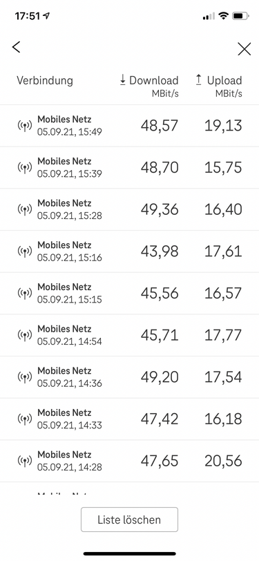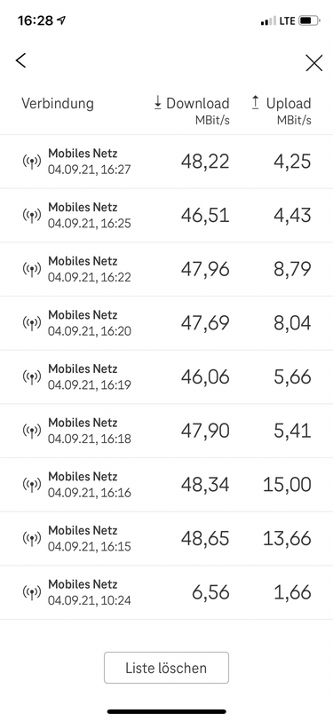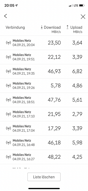 Sieht gut aus. Ein paar mal ist die Messung im Upload fehl geschlagen und zwei mal App abgestürzt während Speedtest.