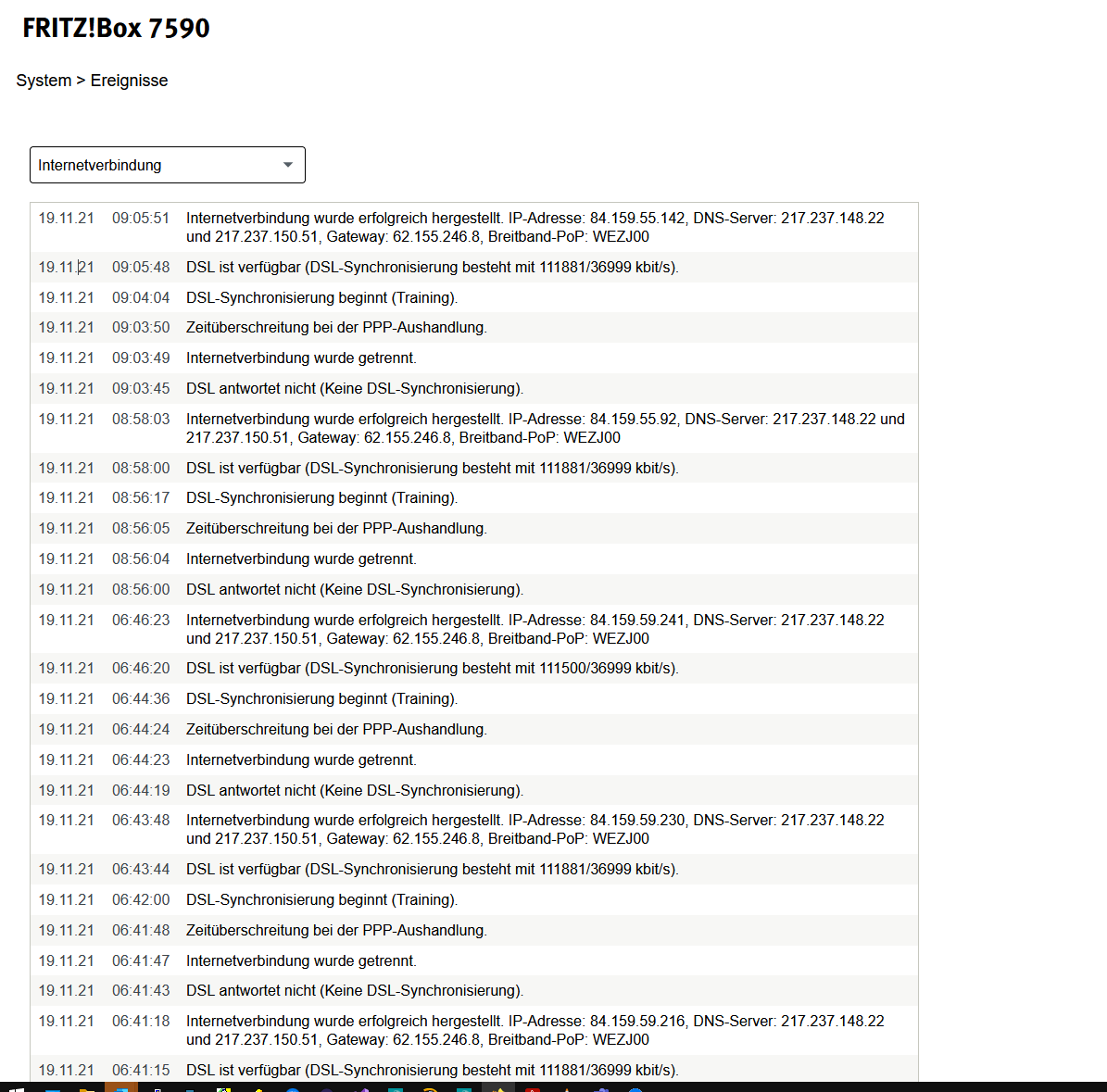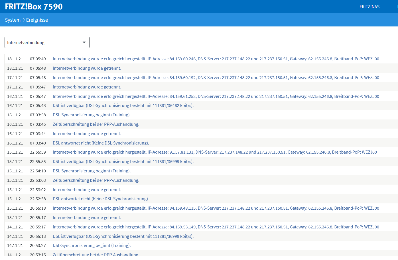 ich habe seit einigen Wochen bereits immer wieder sporadische DSL Verbindungsabbrüche. Auffällig ist das die Abbrüche besonders häufig beim Versuch größere Downloads per Browser zu machen auftreten. Also dann wenn die Leitung mal über längere Zeit unter Last ist. Mittlerweile häufen sich aber auch die Abbrüche bei normaler Nutzung, bspw. MS Teams im Homeoffice. Anbei weitere Angaben inkl. internet Log der Fritz!Box.