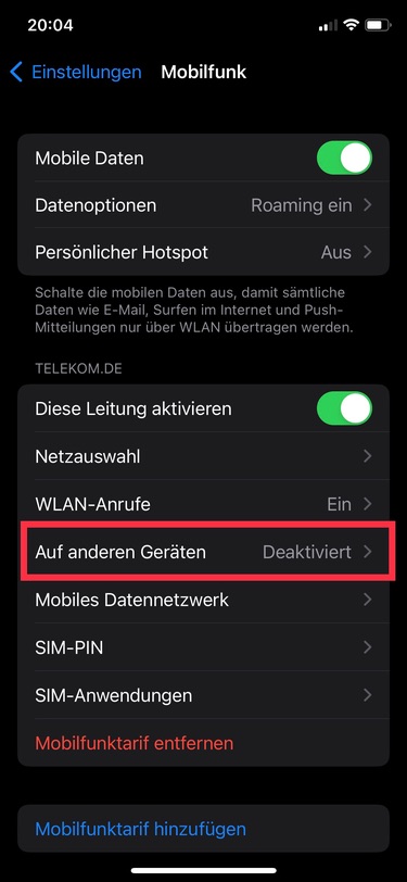 Bei mir gibt es allerdings den Schalter „WLAN Anrufe für andere Geräte“ gar nicht (siehe mein zweiter Screenshot mit dem schwarzen Hintergrund.