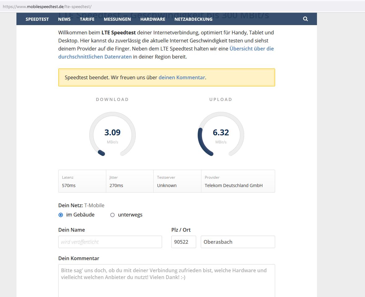 • Hier wäre interessant ob die Handy Sim Karte auch eine Congstar Sim-Karte ist und welche Datenrate der Vertrag hätte. Da eine LTE Zelle ja ein Shared Medium ist kann die niedrige Rate durchaus vorkommen.