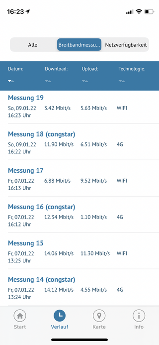 Versuche bitte jeweils (Handy und Router) 3 Tests am selben Tag Morgens, Mittags und Abends durchzuführen. Dann kann optimal geprüft werden. Sorry für die Umstände, aber leider sind die Daten nötig,