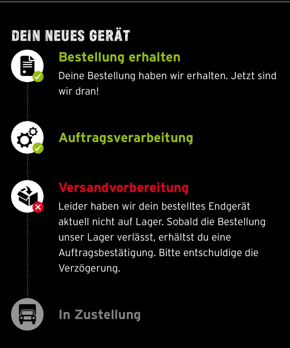 • Warum wurde dann der Status von Rot auf Endspurt geändert? Das ist doch falsche Hoffnung machen. Ich bin neu bei Congstar (vorher 20 Jahre Telekom) und deshalb frage ich mich natürlich ob das dann normal ist. Das Forum hier finde ich super und das ihr euch die Mühe macht andauernd nach den Lieferzeiten zu schauen auch 👍.