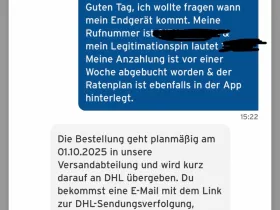 Guten Morgen, bei mir steht nur, dass mein Endgerät nicht vorrätig ist nachdem es von Auftragsverarbeitung auf Versandvorbereitung gesprungen ist, na toll