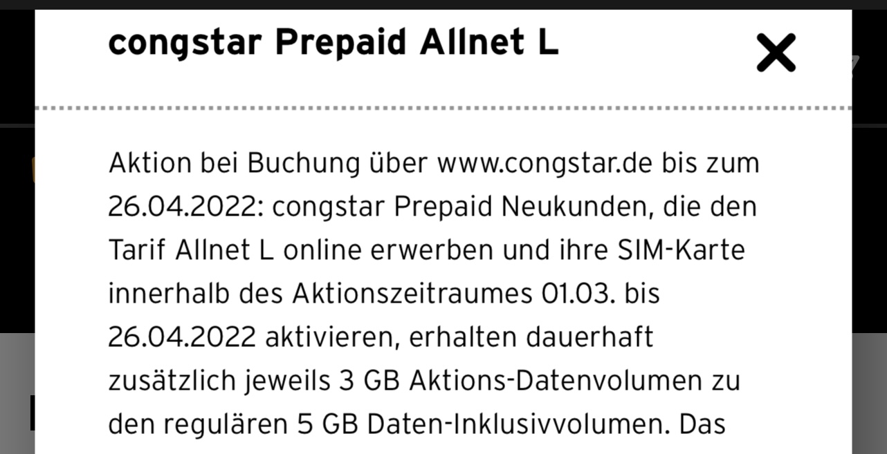Hallo liebes CongstarTeam, ich habe am Montag online aufgrund ihrer Aktion: dauerhaft 5+3GB von der Allnet Flat M auf die Allnet Flat L gewechselt. Nun wurde mir heute jedoch nur das 5GB Vetragsvolumen auf mein Konto gebucht, was ich für 15€ im Vergleich zu anderen Anbietern einfach für zu wenig empfinde & ohne die Aktion auch so niemals gebucht hätte... Ich bin als treuer Kunde seit über 7 Jahren leider sehr enttäuscht & hoffe auf eine schnelle Lösung! LG