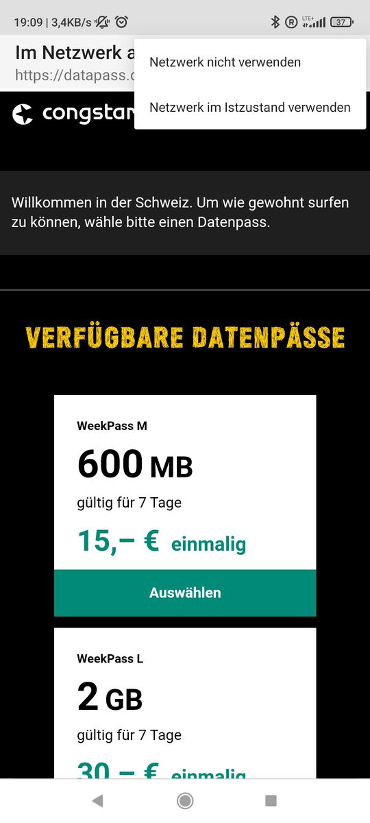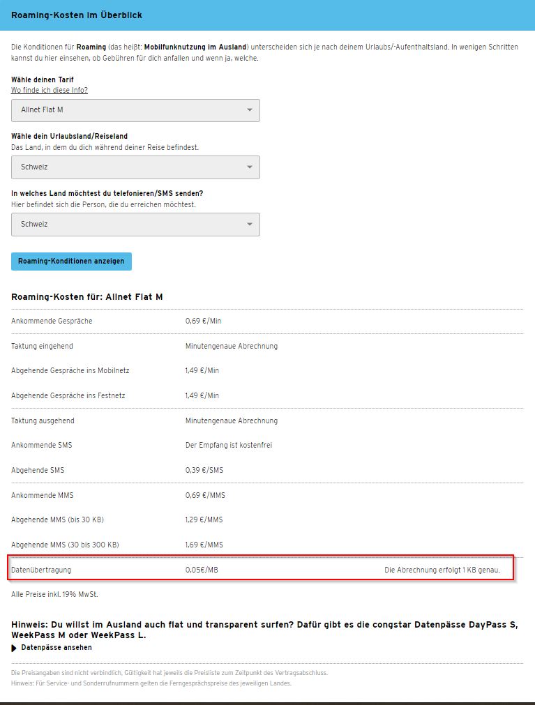 ich habe den Allnet Flat M Tarif und war am Samstag in der Schweiz und wollte dort ohne Datenpass im Roaming surfen. Ich habe das Roaming im Handy aktiviert und schon kam von Android System, dass ich einen Pass auswählen soll, oben konnte ich auswählen, dass ich das Netzwerk im Istzustand verwenden möchte (siehe Bild). Das würde für mich bedeuten, dass ich in der Schweiz für 0,05€/MB surfen kann, so wie es im Roamingrechner (siehe zweites Bild), auf welchen immer verwiesen wird, steht. Was habe ich hier jetzt falsch gemacht? Ich wohne grenznahe am Bodensee und habe öfters Schweizer Netz und wenn ich kurz was schauen möchte, reichen mir 10MB sehr weit, was ja dann nur 0,50€ Kosten würde.