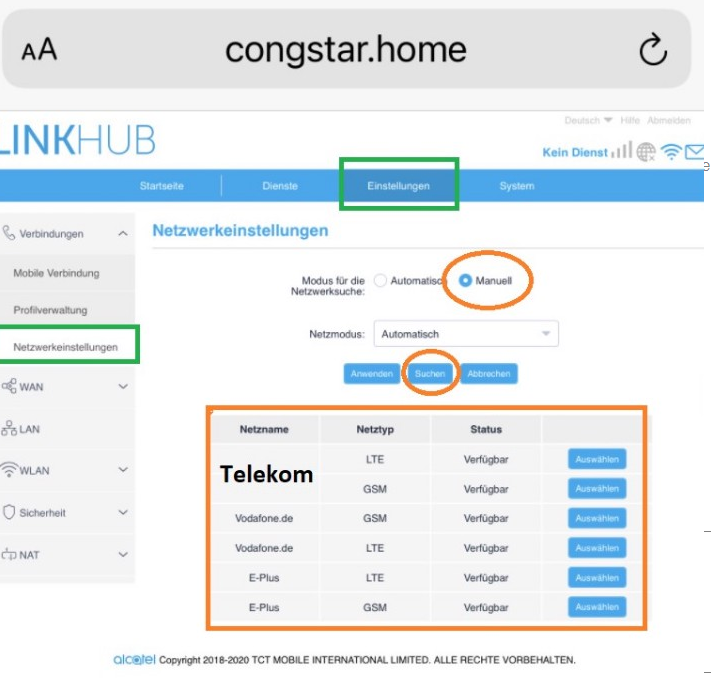 (Viele Male den Router neugestartet, App (Alcatel WLAN Link) deinstalliert und neu installiert...). Habe die SIM-Karte auch schon ins Handy getan - dort ging es. Danach im Router wieder nicht. Die LED-Anzeigen leuchten alle, bis auf das LAN-Zeichen und das Network-Zeichen blinkt die ganze Zeit.