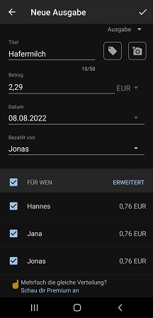 Ihr legt einen Tricount an und nennt diesen zum Beispiel WG. Hier gebt ihr an, in welcher Währung das ganze abgerechnet werden soll, könnt eine Kategorie wählen (bspw. Reise, WG, Paar) und gebt euren Nutzernamen ein. Diesen Tricount könnt ihr dann mit den Nutzern teilen, mit denen ihr eure Kosten teilt. Es gibt dann eine Übersichtsseite mit Ausgaben und Salden. Unten stehen für euch als Einzelperson eure gesamten Kosten und die Gesamtausgaben der ganzen Gruppe. Über das Plus in der Mitte gebt ihr eine neue Ausgabe ein. Zum Beispiel geht Jonas Hafermilch kaufen und trägt dann im Tricount ein, dass er die Milch für sich, Hannes und Jana gekauft hat. Der Betrag wird dann also durch 3 geteilt: