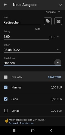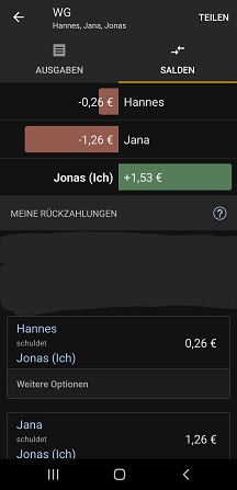 Unter Salden könnt ihr dann sehen, wer wem wie viel Geld schuldet. In unserem Beispiel schulden Hannes und Jana dem Jonas noch Moneten – Rot= Schulden, Grün= Guthaben. Ihr könnt so lange einen Schuldenberg anhäufen wie ihr wollt und darauf hoffen, dass sich das irgendwann wieder ausgleicht. Wenn ihr das aber blöd findet, könnt ihr euch absprechen und z.B. einmal im Monat die anderen auszahlen. Unter Salden seht ihr ja, wem ihr was schuldet.