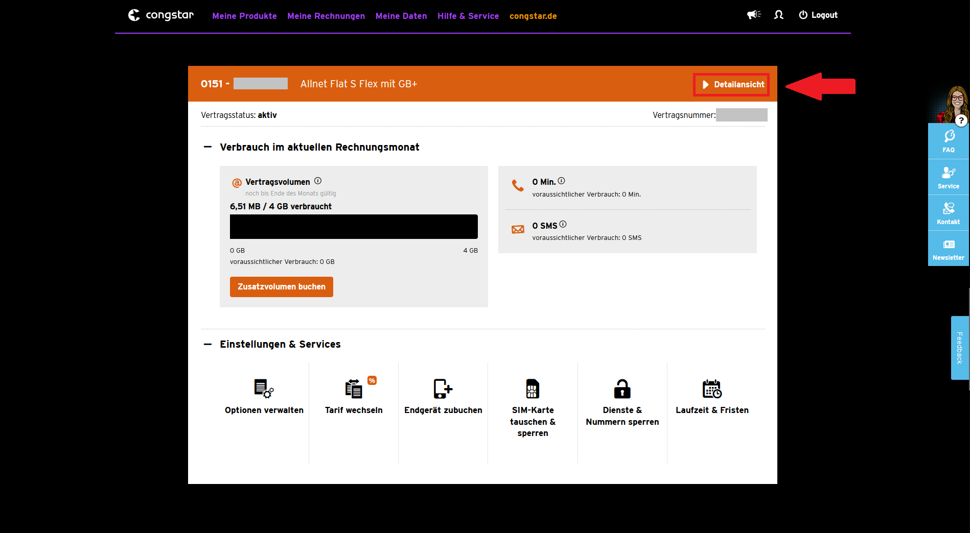 2. Scrollt nun runter zu dem Vertrag, um den es euch geht und klickt rechts neben der Rufnummer auf Detailansicht: