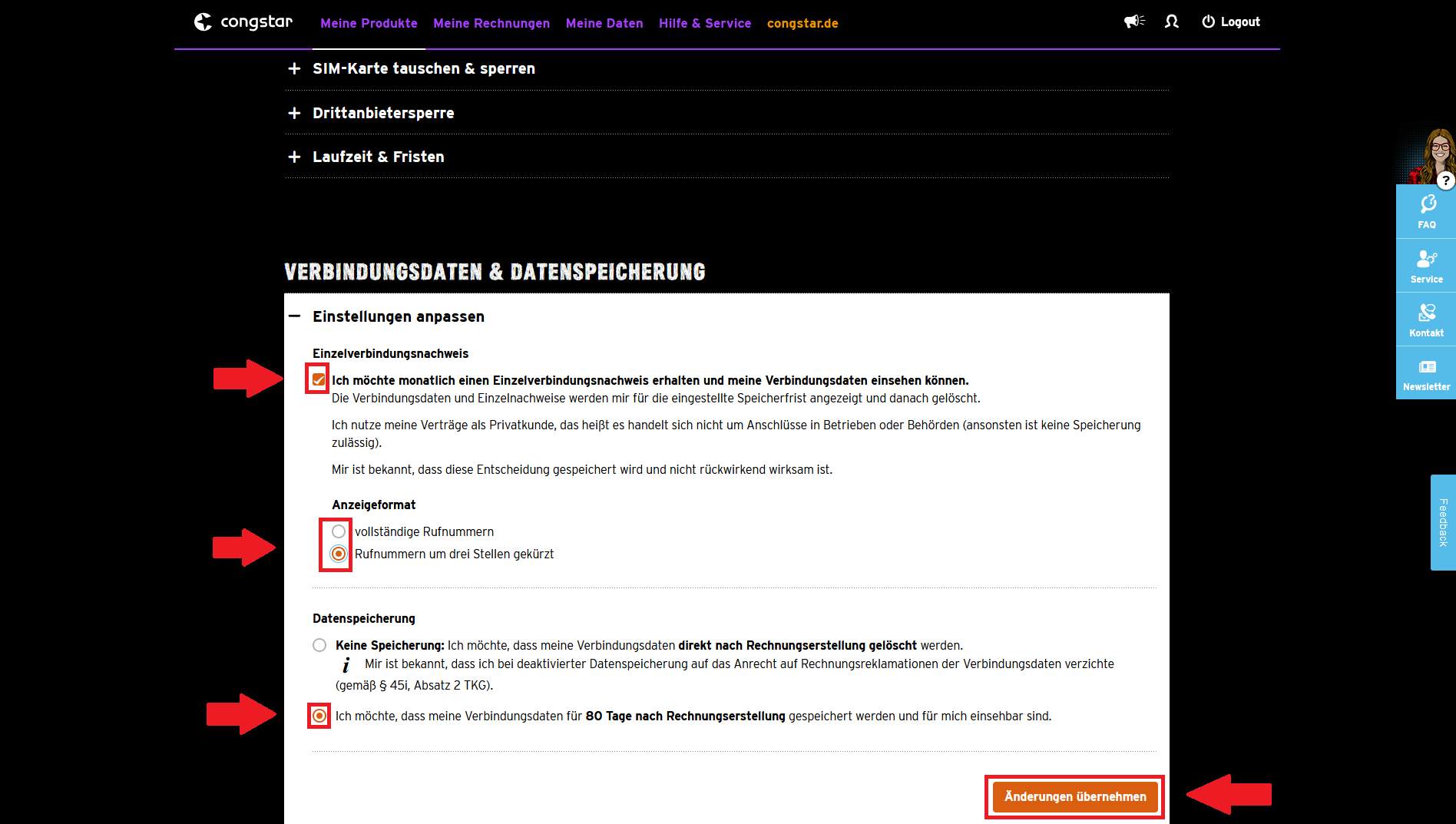 6. Damit wir eure Verbindungsdaten für den EVN (und für etwaige Rechnungsanfragen generell) speichern dürfen, stimmt ihr jetzt bitte noch der Datenspeicherung zu und klickt auf Änderungen übernehmen.
